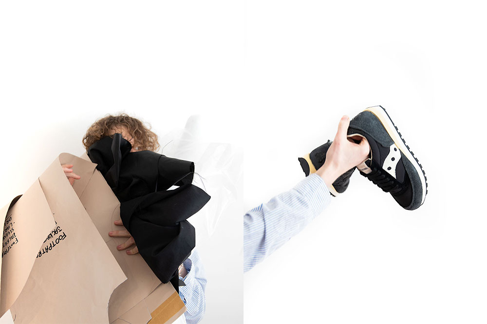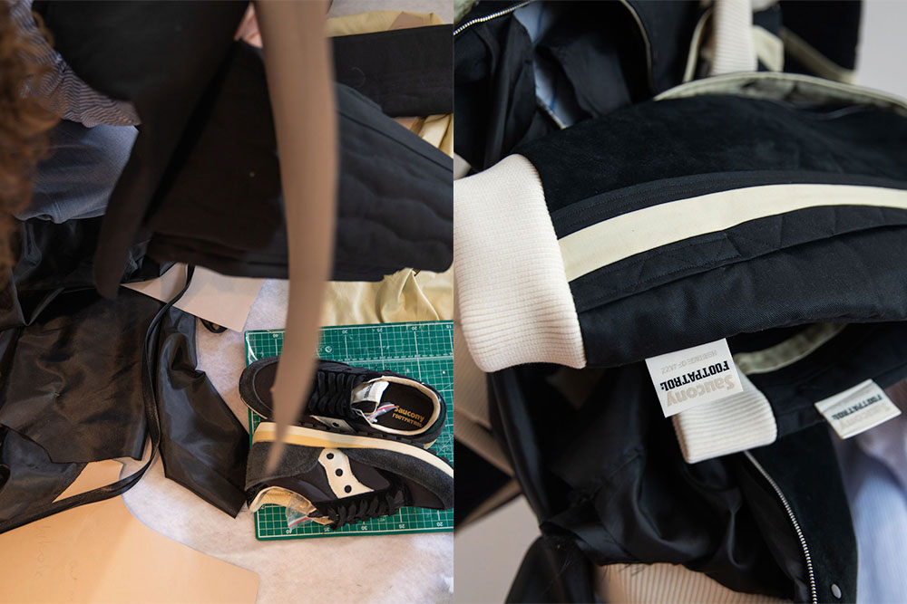 S : Mon objectif principal était de retranscrire la Footpatrol x Saucony Jazz en veste. Je me suis donc référé aux matériaux utilisés, ses couleurs et les superpositions de couches présentes sur la chaussure. Une fois le design de la veste finalisé, je pouvais alors commencer à imaginer son patron. Et après avoir produit un exemplaire très prometteur et calibré toutes les tailles moi-même, je me suis senti confiant pour aller de l’avant et produire les 10 pièces totales. Tout le processus de création s’est déroulé dans mon studio à Londres.